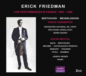야샤 하이페츠가 인정한 유일한 제자라는 평을 받는 바이올리니스트 에릭 프리드만이 전성기인 1960년대 중후반에 프랑스에서 가졌던 공연이 최초로 음반화되었다. 멘델스존 협주곡과 비탈리 샤콘에서 서늘하고 날렵하게 질주하는 모습은 스승 하이페츠를 연상시키지만, 브람스 소나타나 베토벤 협주곡에서는 그보다 한층 따뜻하고 섬세한 면모가 깊은 인상을 주며 드뷔시 소나타는 스튜디오 녹음을 능가하는 실황의 열기가 가득하다. 언제나 꼿꼿한 예술가의 길을 고집했던 프리드만의 가장 뛰어난 순간을 잡아낸 음반이다.